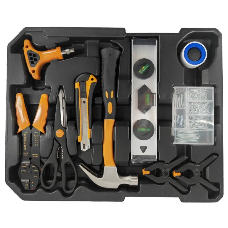 - Martillo, nivel de burbuja, cúter, tijeras, alicates de crimpado, cinta aisladora, tornillos, clavos, bridas, grapas y chinchetas.