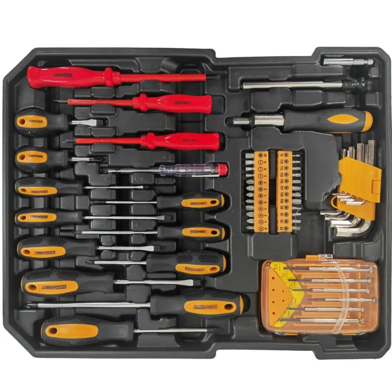 - 6 destornilladores de punta plana (1 totalmente aislado), 7 destornilladores Phillips (2 totalmente aislados), comprobador de corriente, destornillador de trinquete con 2 juegos de puntas y portapuntas, destornillador de precisión, bolígrafo neumático, vaso hexagonalConjunto