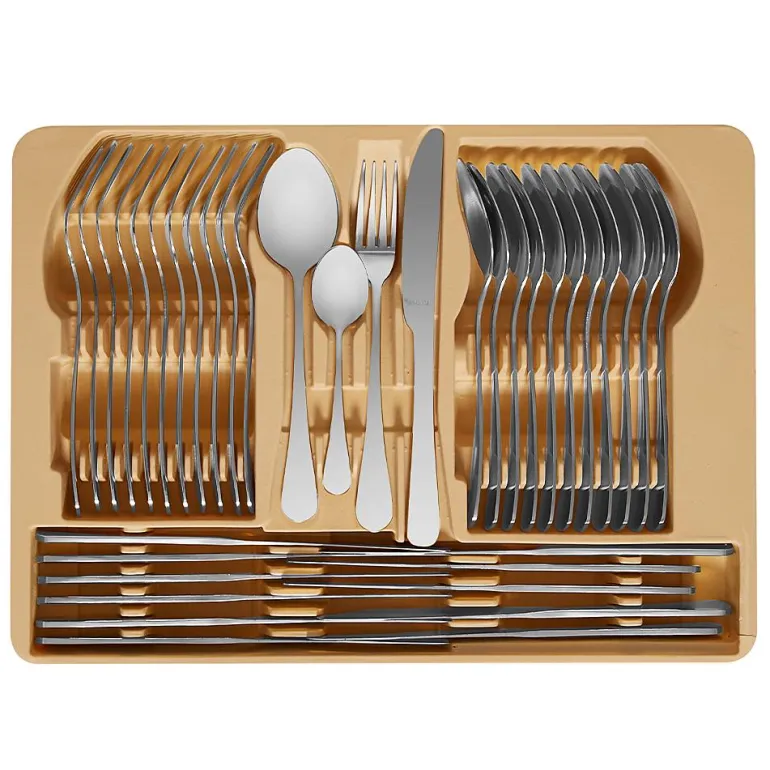 - Conjunto compuesto por 12x cuchillo, 12x tenedor, 12x cuchara, 12x tenedores para postre, 12x cucharaditas, 1x cuchara/cucharón, 3x cucharada, 1x tenedor para ensalada, 1x espátula para pastel, 1x pinzas para azúcar/hielo, 1x cucharadita para azúcar, 2 tenedores para carne, 2x cucharas de servicio
