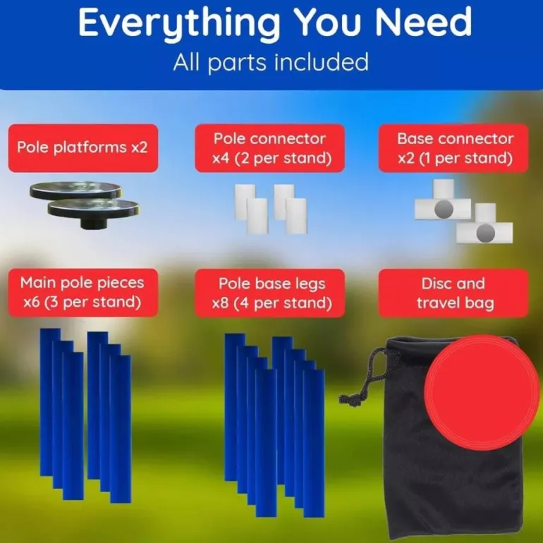 - Contenido: Bolsa de transporte, frisbee (diámetro aprox. 25,5 cm), plataformas, conectores, tubos, clavijas, instrucciones de uso.
