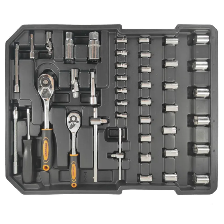 - 2 trinquetes de accionamiento cuadrado (½ y ¼ de pulgada), 14 vasos de 8 a 30 mm, 15 vasos de 4 a 14 mm, extensión, 2 mangos en T