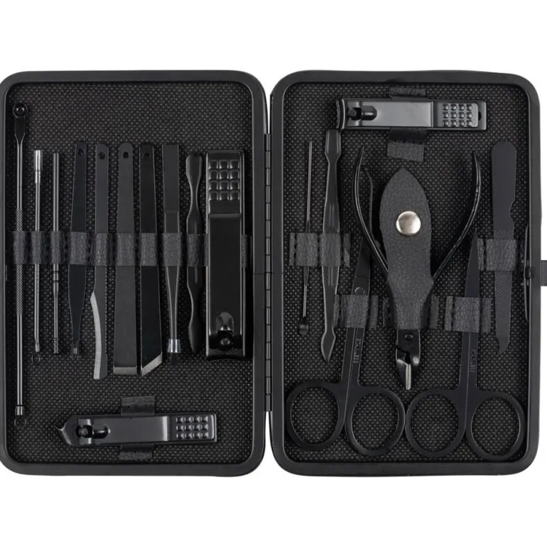 - Conjunto contiene dos tijeras, dos agujas para acné, cortacutículas, pinzas, cortacutículas, cortauñas grande, cortauñas pequeño, lima de uñas, cepillo para limpiar uñas, limpiador de oídos, cuchara para oídos, broche de presión, tenedor para quitar la piel:, removedor de callos plano, inclinado, en zigzag y estuche
