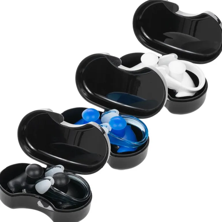- Conjunto que consta de tres estuches, cada uno con un par de tapones para los oídos y una pinza para la nariz